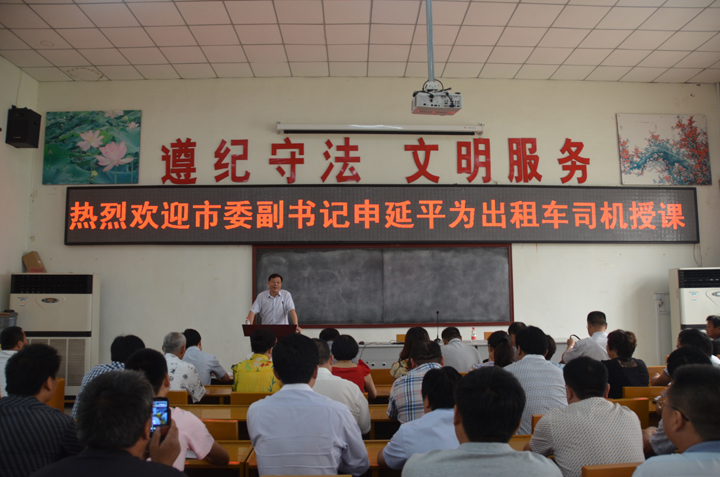 6月10日,濮陽(yáng)市委副書(shū)記申延平到濮陽(yáng)市出租車司機(jī)文明學(xué)校為200名出租車司機(jī)志愿者上課培訓(xùn)