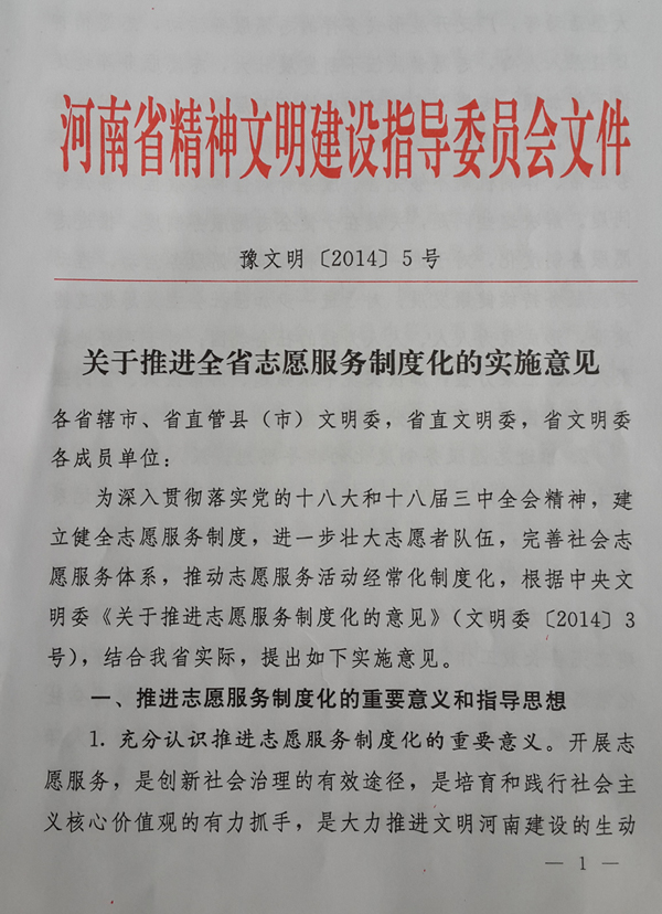 1、充分認(rèn)識(shí)推進(jìn)志愿服務(wù)制度化的重要意義。開展志愿服務(wù),是創(chuàng)新社會(huì)治理的有效途徑,是培育和踐行社會(huì)主義核心價(jià)值觀的有力抓手,是大力推進(jìn)文明河南建設(shè)的生動(dòng)實(shí)踐。近年來(lái),全省廣大志愿者圍繞扶危濟(jì)困、應(yīng)急救援、大型活動(dòng)等,廣泛開展形式多樣的志愿服務(wù)活動(dòng),志愿精神日益深入人心,志愿者隊(duì)伍不斷發(fā)展壯大,志愿服務(wù)陣地建設(shè)不斷加強(qiáng),志愿服務(wù)的熱潮在城鄉(xiāng)基層蓬勃興起。但從整體上看,我省志愿服務(wù)還處于起始階段,存在著活動(dòng)開展不夠經(jīng)常、體制機(jī)制不夠完善、服務(wù)針對(duì)性和實(shí)效性不夠強(qiáng)等問(wèn)題。解決這些問(wèn)題,關(guān)鍵在于健全志愿服務(wù)制度。推進(jìn)志愿服務(wù)制度化,對(duì)于進(jìn)一步鼓勵(lì)和規(guī)范志愿服務(wù)活動(dòng),推動(dòng)志愿服務(wù)持續(xù)健康發(fā)展;對(duì)于進(jìn)一步加強(qiáng)社會(huì)主義思想道德建設(shè),形成我為人人、人人為我的社會(huì)氛圍;對(duì)于更好地凝聚人心、匯聚力量,加快實(shí)現(xiàn)中原崛起、河南振興、富民強(qiáng)省的奮斗目標(biāo),具有十分重要的意義。
